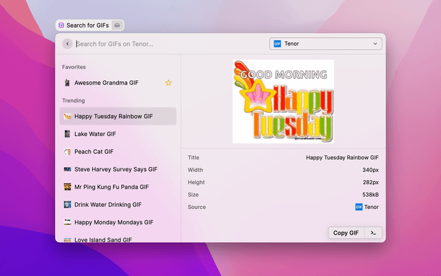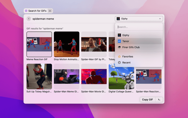 Elevat your Mac workflow with the GIF Search extension. This extension searches for animated GIFs from the internet using Giphy, Tenor, or The Finer Gifs Club. Switch between the various services using the search bar dropdown.